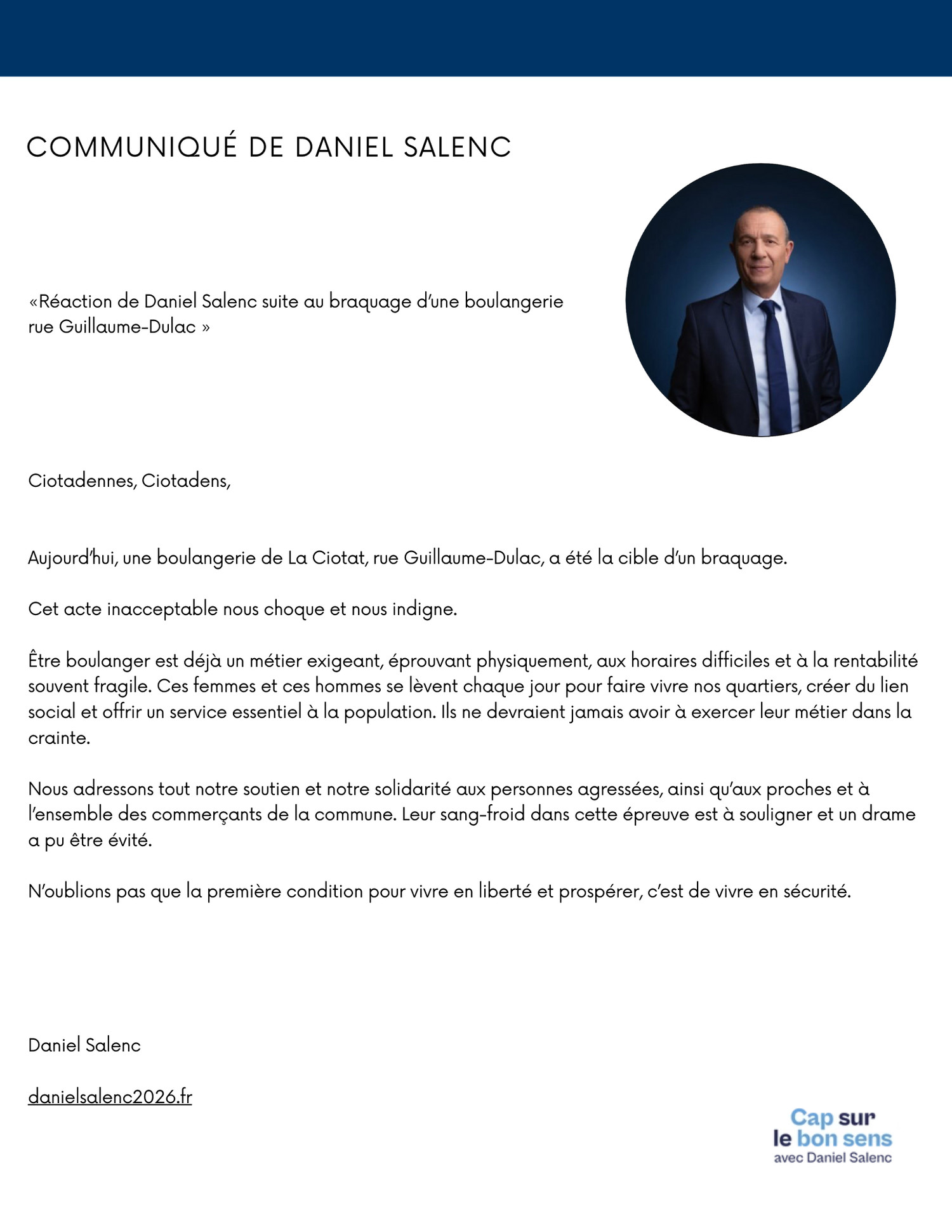 Communiqué de Daniel Salenc suite au braquage d'une boulangerie Ciotadenne.